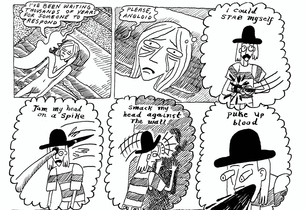 Older Zak Sally looking in the mirror throughout the comic, intercut between parts of the main story