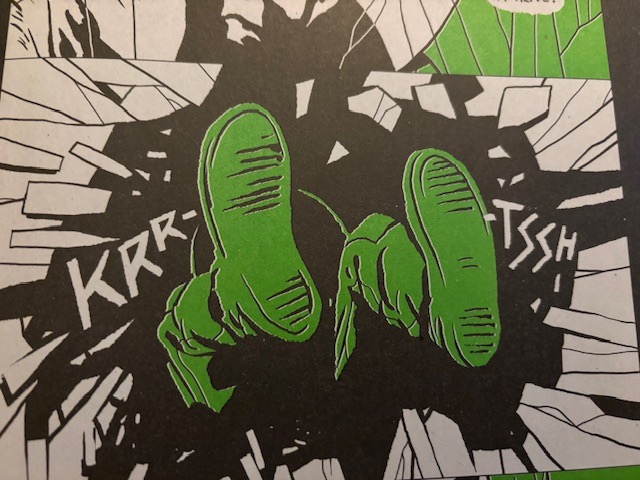 I love the panel (below) showing the main character’s feet smashing through glass. The shapes Tyler Landry draws look like loose mass, have personality.