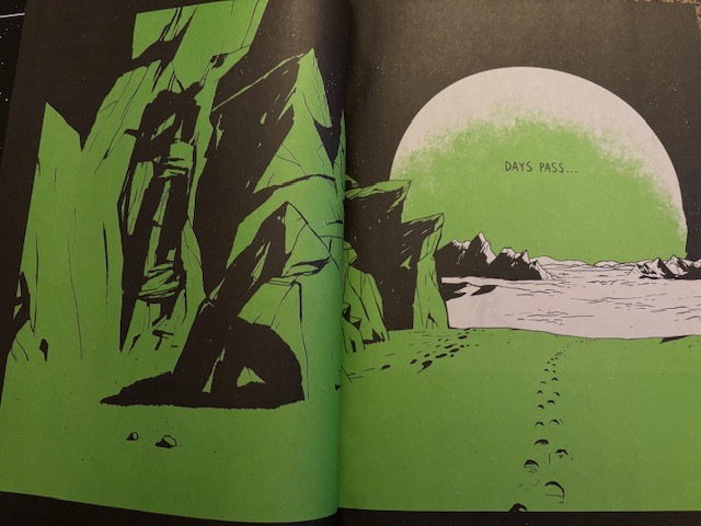 I like Tyler Landry’s use of black in this comic. The way the art is printed, the use of black ink feels very definite. The entire printed page is on black paper with a toothy, grainy feel. Really gives the impression of being lost in space.