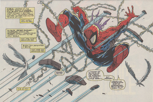 The weird, almost disturbing poses even speak to a primitiveness of the character. Traditionally, comic artists focus on the human aspect when they draw Spider-man; a young guy in tights trying to make a difference. When Spider-man clings to a wall in a McFarlane comic, something animalistic seeps from the hero. The spider element becomes a bit more vital. The character becomes inherently a little darker. The popping veins and big, bug eyes communicate an idea of torture. A reader understands Spider-man’s guilt, determination, and origin point.