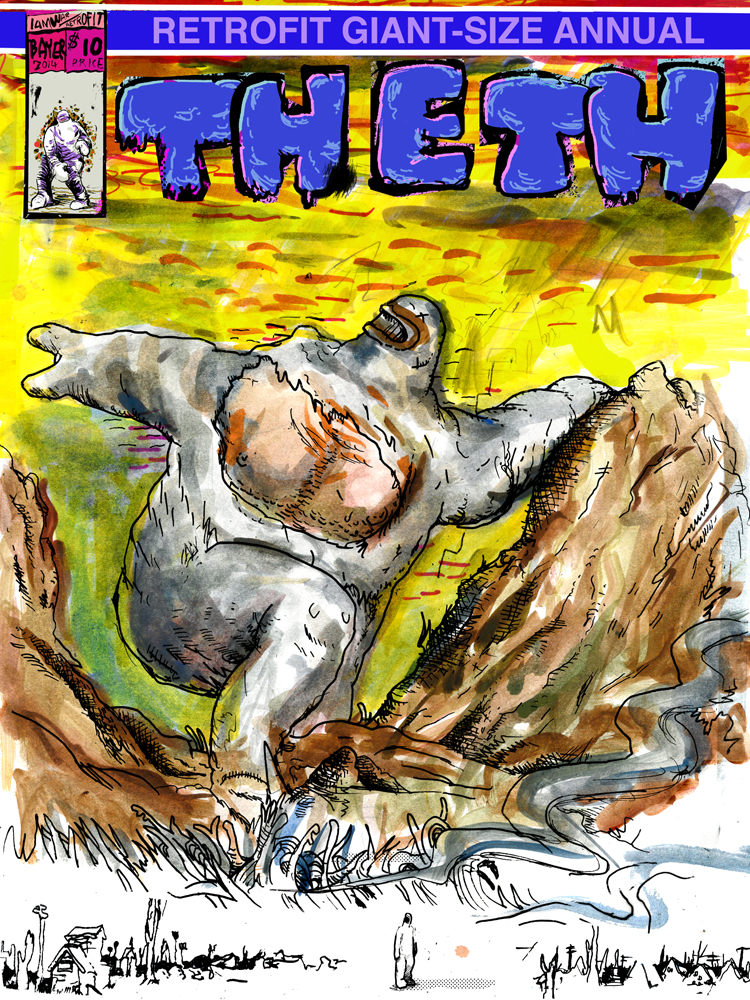 I’d originally thought the protagonist of Theth was an abnormally large Yeti, crossing some landscape to escape whatever is over its shoulder, but in actuality it’s the small guy wearing the space suit dreaming below, at the bottom of the cover. His name is Seth. Theth, pronounced with a lisp. He’d like to be a Yeti.