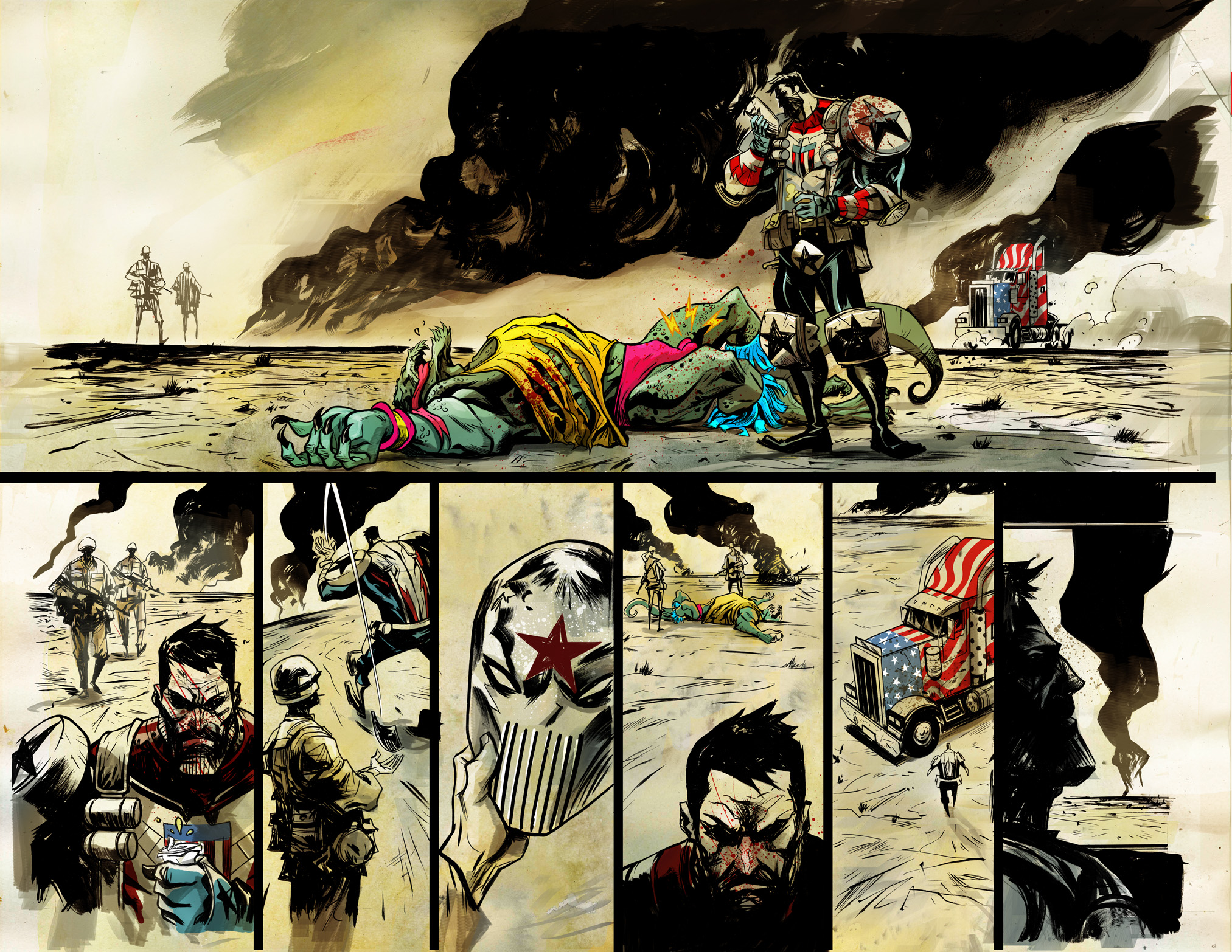 MH: For me nothing is more visceral than layouts. Those first few rough lines that hold so much potential for greatness…it’s kind of downhill from there, and at the bottom of that hill usually is comic book coloring. Color done well CAN have a huge impact on the reader, but so often in comics it feels that the line art is treated just as a coloring book. We add color in each spot, not because it makes the page stronger, but because we expect to see every white space filled. So we color everywhere, keep it in the lines, and keep the approach consistent throughout. It’s boring.