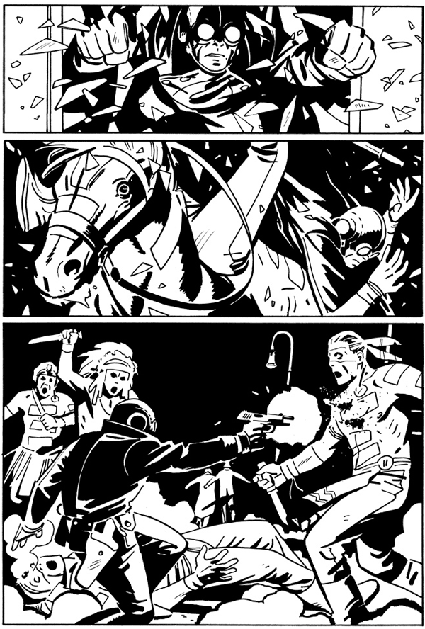 I still enjoy it, though. I’m a guy for which style overbears execution, and Blood chapter 2 is the poster child of such attitude. Even so, it’s only one section of the 80 page Dark Horse Presents, and I’m most likely alone in the enjoyment. As Adams puts it, nobody is listening. Listening to Blood or Dark Horse Presents. While both subjects could light a fire under the industry’s ass, execution is poor and holds back any attempt at game changing or award worthy quality. Once upon a time, Adams and DHP could do such a thing. Today, both Adams and DHP are revamped versions of themselves, laced with bits that sound tasty in passing, but when actually read pack no punch.